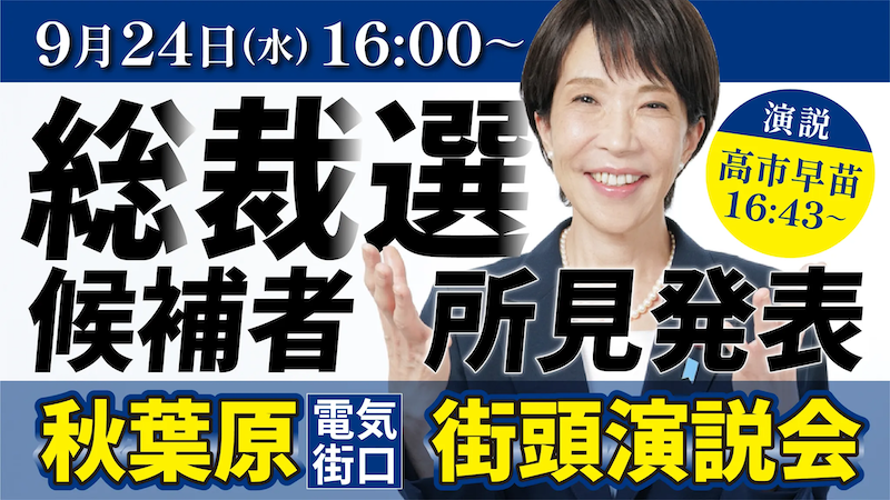 自民党総裁選 所見発表街頭演説会(24日16時~) 投稿日 2025年9月23日 著者 高市早苗自民党総裁選特設サイト|日本列島を、強く豊かに。 カテゴリー NEWS 24日16時より、総裁選候補による所見発表街頭演説会を行います。 【開催概要】 日時:9月24日(水) 16:00開始名称:自民党総裁選 所見発表街頭演説会場所:秋葉原駅電気街口 候補者所見発表演説は16:10より、高市早苗の演説は16:43~16:53を予定しております。 15:20より聴衆エリアの受付を開始いたします。 皆様、高市早苗の訴えを「生」でお聞きください。 投稿一覧に戻る →