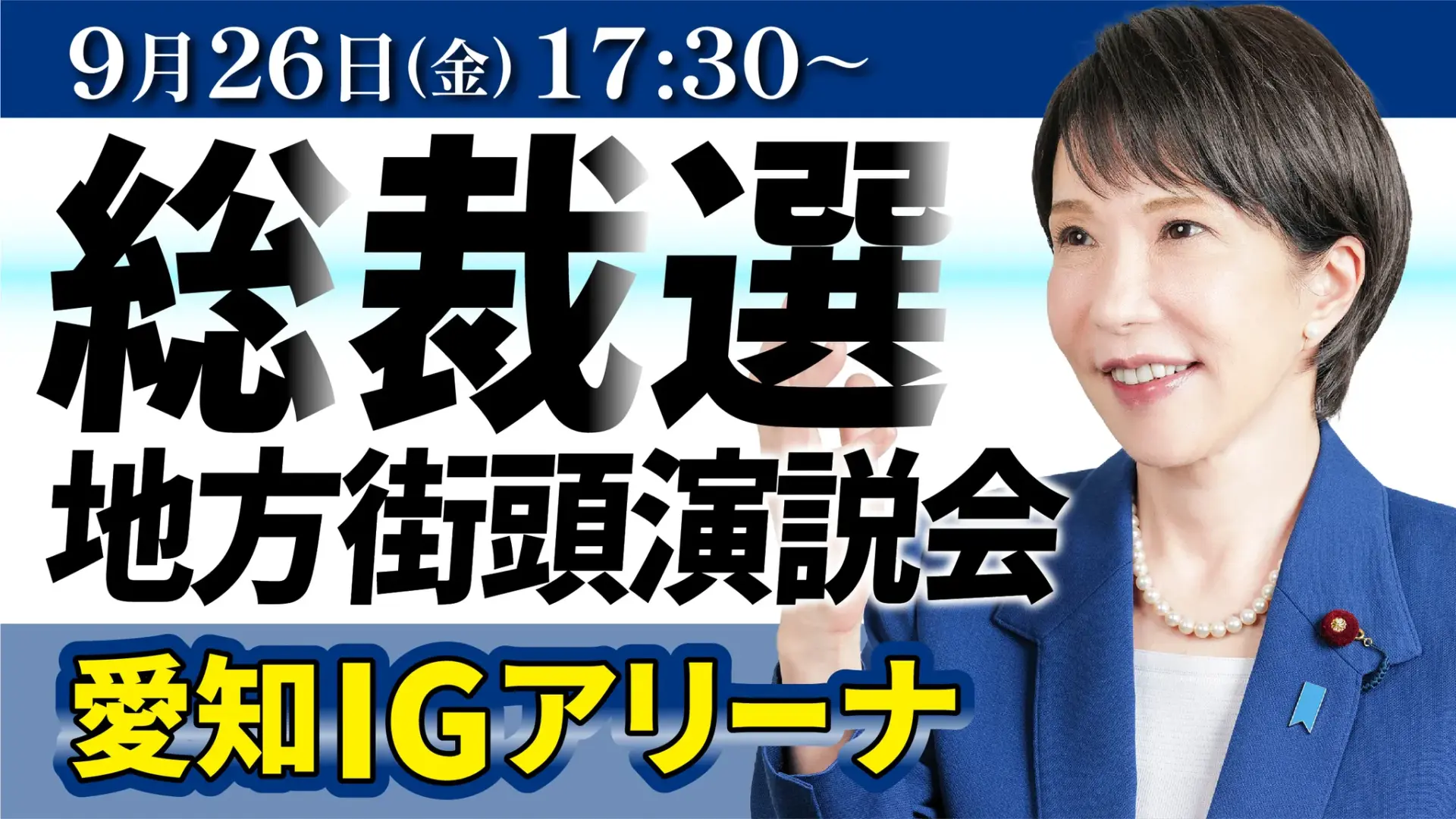 自民党総裁選 地方演説会 in 愛知(26日17:30~) 投稿日 2025年9月26日 著者 高市早苗自民党総裁選特設サイト|日本列島を、強く豊かに。 カテゴリー NEWS 26日17:30より、愛知県IGアリーナにて、総裁選候補による地方演説会を行います。 【開催概要】 日時:日時:9月26日(金) 17:30開始 名称:自民党総裁選 地方演説会愛知県 場所:IGアリーナ 1階サブアリーナ 住所:愛知県名古屋市北区名城1丁目4-1 愛知県にお住まいの皆様、高市早苗の声を「生」でお聞きください。 投稿一覧に戻る →