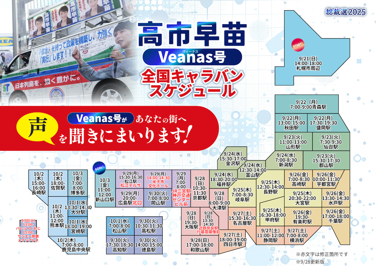 高市早苗Veanas号では、日本全国をキャラバンしながら皆様からのご意見を募集しています。ぜひ、あなたの貴重なご意見をお聞かせ下さい!